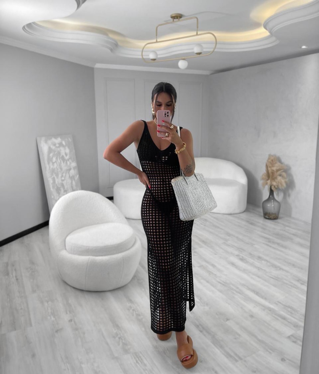 Vestido no Crochê, fendas laterais. Modelo em alça.